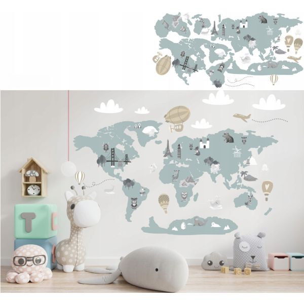 Wallsticker - Map with Animals and Hot Air Balloons